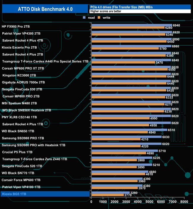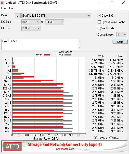 Kioxia rate the read/write Sequential performance of the 1TB BG5 as up to 3,500MB/s and 2,900MB/s respectively. Using the ATTO benchmark we couldn't quite hit those maximums with test result figures of 3,280MB/s for reads and 2,770MB/s for writes.