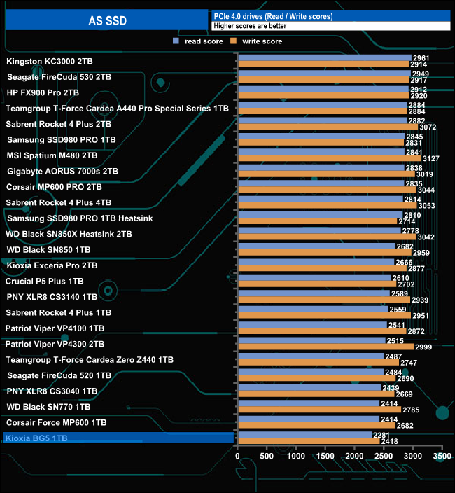 The BG5 seemed to struggle a bit with the more demanding AS-SSD benchmark with Sequential read/write figures of 3,117MB/s and 2,669MB/s respectively. Its write score of 2418 is stronger than its read score but both put the drive in last place in the results table.