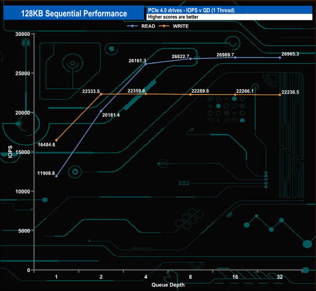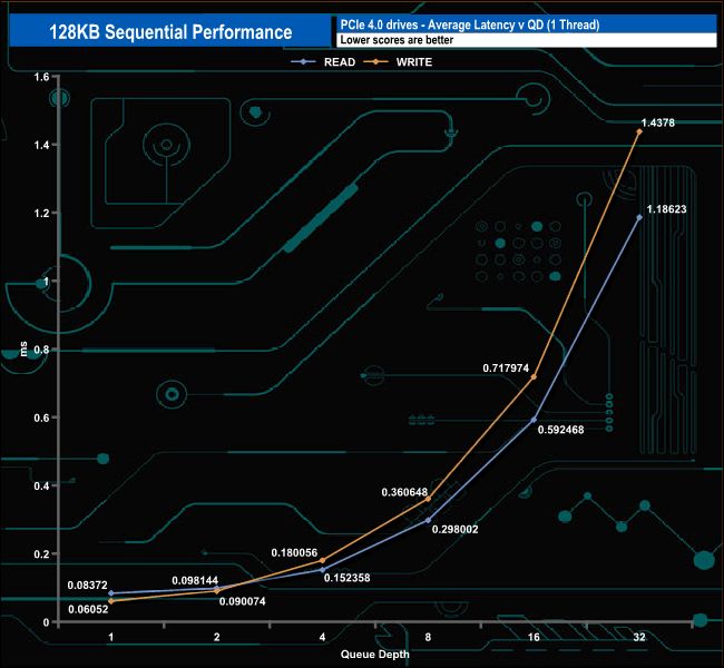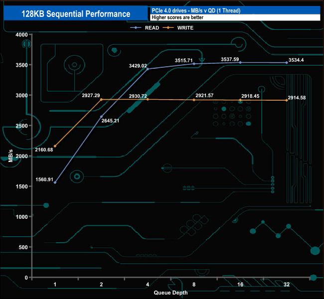 We used CrystalDiskMark 8‘s custom settings to test the Sequential read and write performance of the drive through a range of queue depths. The setup for the tests is listed below.