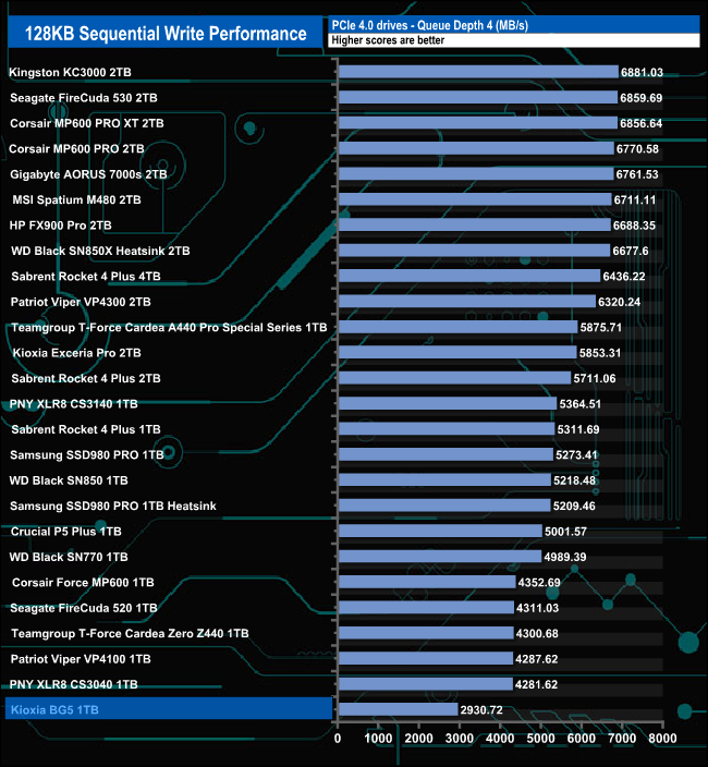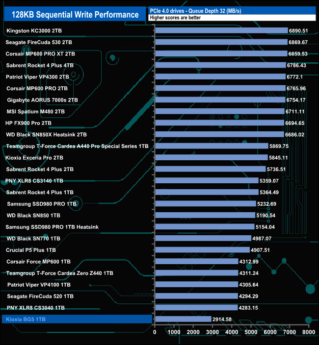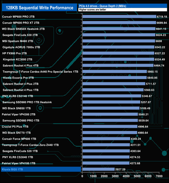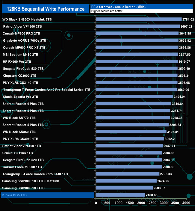 When it comes to Sequential write performance the drive sits firmly at the bottom of our results chart for all the tested queue depths,