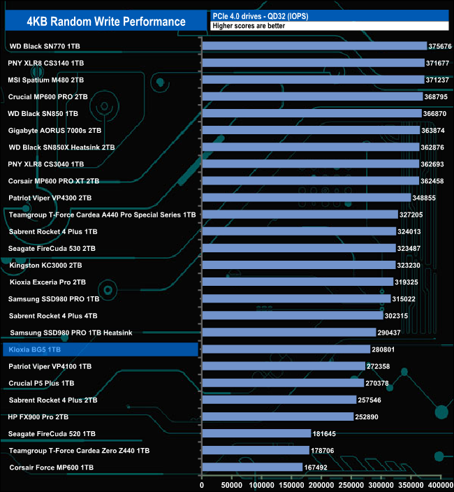 With our 4-threaded random write tests, the best result we saw from the drive was 281,205 IOPS at QD16, with the performance dropping back to 280,801 IOPS at the end of the test at QD32, both figures nowhere near the official maximum rating of 450,000 IOPS.