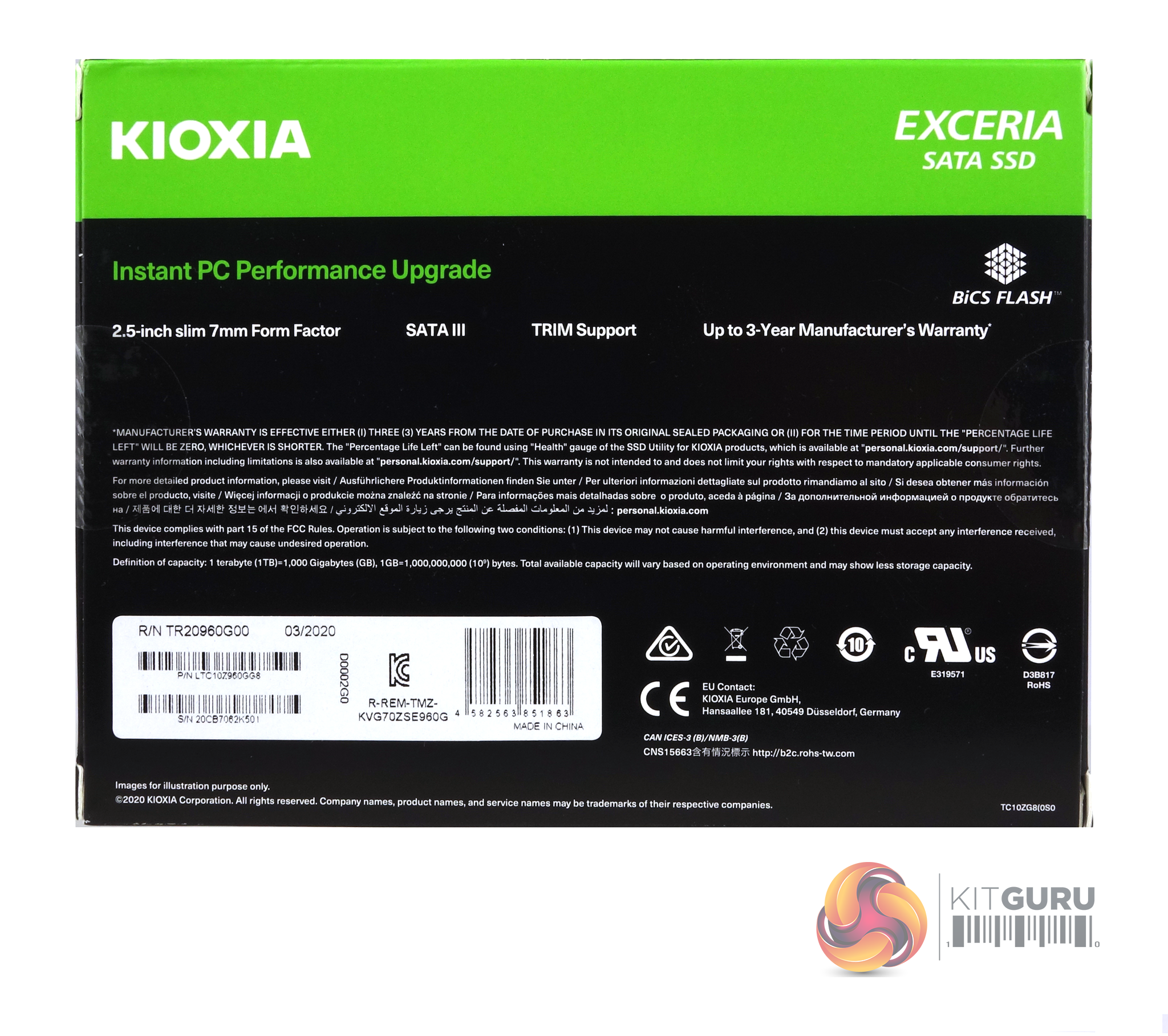 The front of the box is dominated by an image of the drive with the capacity listed on the bottom left-hand side of the box. The rear of the box has a description of the drive's format, the fact it uses BiCS Flash, supports TRIM and has a 3-year warranty.