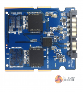 One side of the PCB has two packages of BiCS 3D TLC NAND (coded TH58TFT1T23BS8) while the other side of the board holds another two NAND packages and the tiny Toshiba (TC58NC1010GSB) controller. Details on the controller are pretty hard to find. The controller has a thermal pad stuck to it to wick away the heat from the controller into the drives enclosure. One thing to note is that the drive is a DRAM free design.