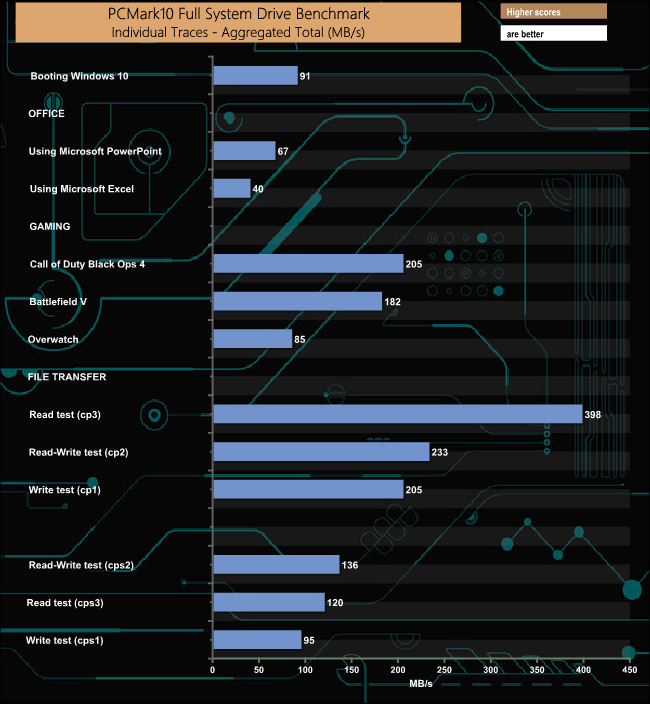 The PCMark 10 Full System Drive Benchmark uses a wide-ranging set of real-world traces from popular applications and common tasks to fully test the performance of the fastest modern drives. The benchmark is designed to measure the performance of fast system drives using the SATA bus at the low end and devices connected via PCI Express at the high end.