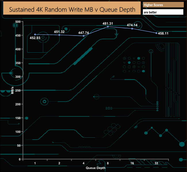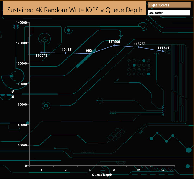 The best 4K random write figure we saw during our 4–threaded testing was 117,506 IOPS (QD8), a long way short of the official maximum 400,000 IOPS. As with the random reads, we did a quick test at a QD of 32 using eight threads which resulted in a figure of 448,325 IOPS, bettering the official maximum.