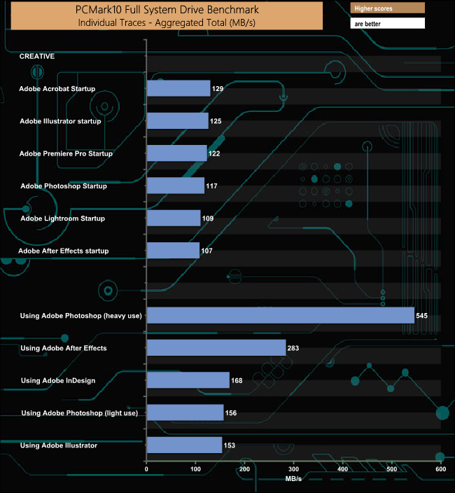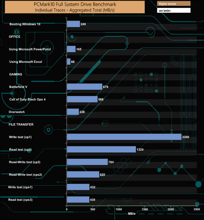 The PCMark 10 Full System Drive Benchmark uses a wide-ranging set of real-world traces from popular applications and common tasks to fully test the performance of the fastest modern drives. The benchmark is designed to measure the performance of fast system drives using the SATA bus at the low end and devices connected via PCI Express at the high end.