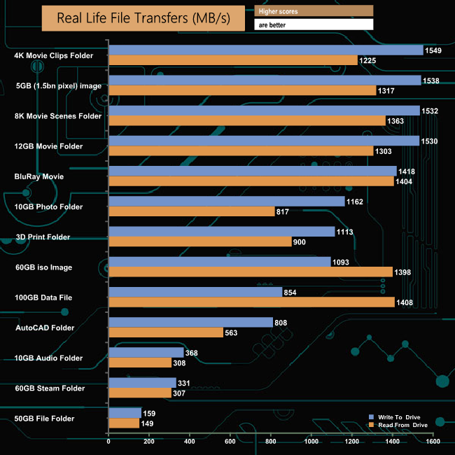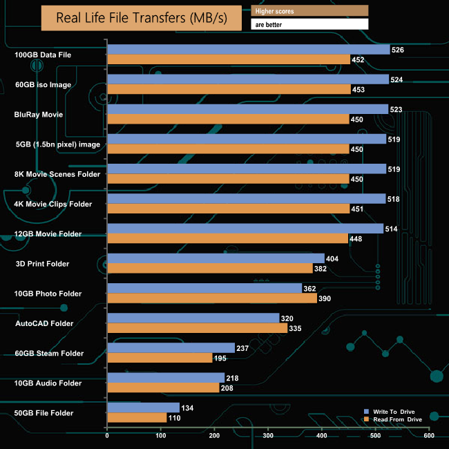 Our real-life file transfers didn’t cause the Exceria NVMe any real problems. The fastest transfer was the AutoCAD folder (3 secs) while it comes as no surprise to see the 50GB file folder transfer as the slowest.