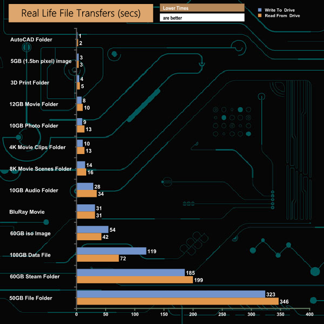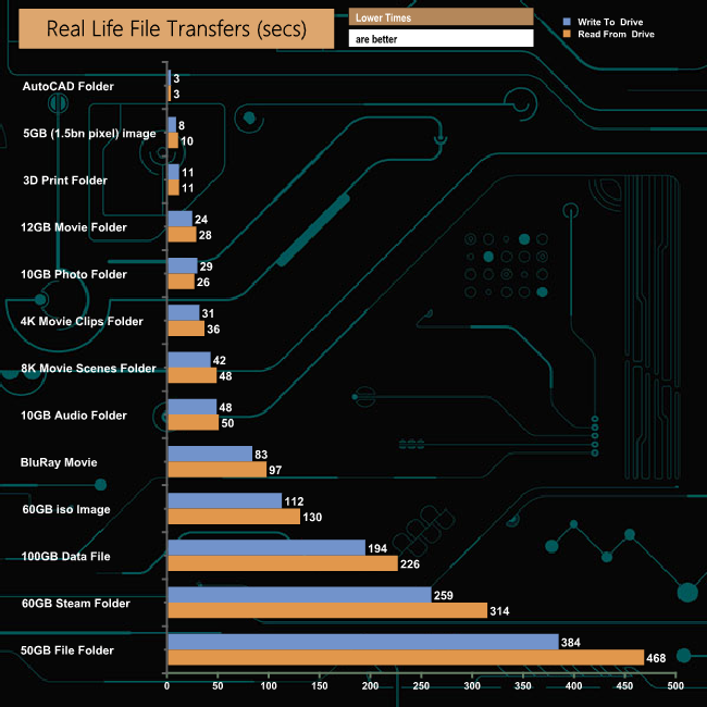 Using the NVMe drive to transfer the files to and from the Exceria NVMe saw the AutoCAD folder once again take the top spot. Similarly, the 50GB file folder transfer was once again the slowest but saw the transfer time reduce from 384 seconds to 323 seconds to write the folder to the drive with the time for reading the data back again reduced from 468 seconds to 346 seconds.