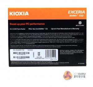 The Exceria NVMe comes in a compact box with an image of the drive on the front, along with a sticker displaying the capacity of the drive. The rear of the box has a description of the drive’s form factor, the fact it uses BiCS Flash, a PCIe Gen 3 x4 interface and has a 5-year warranty.