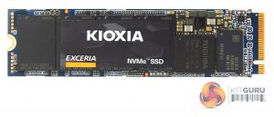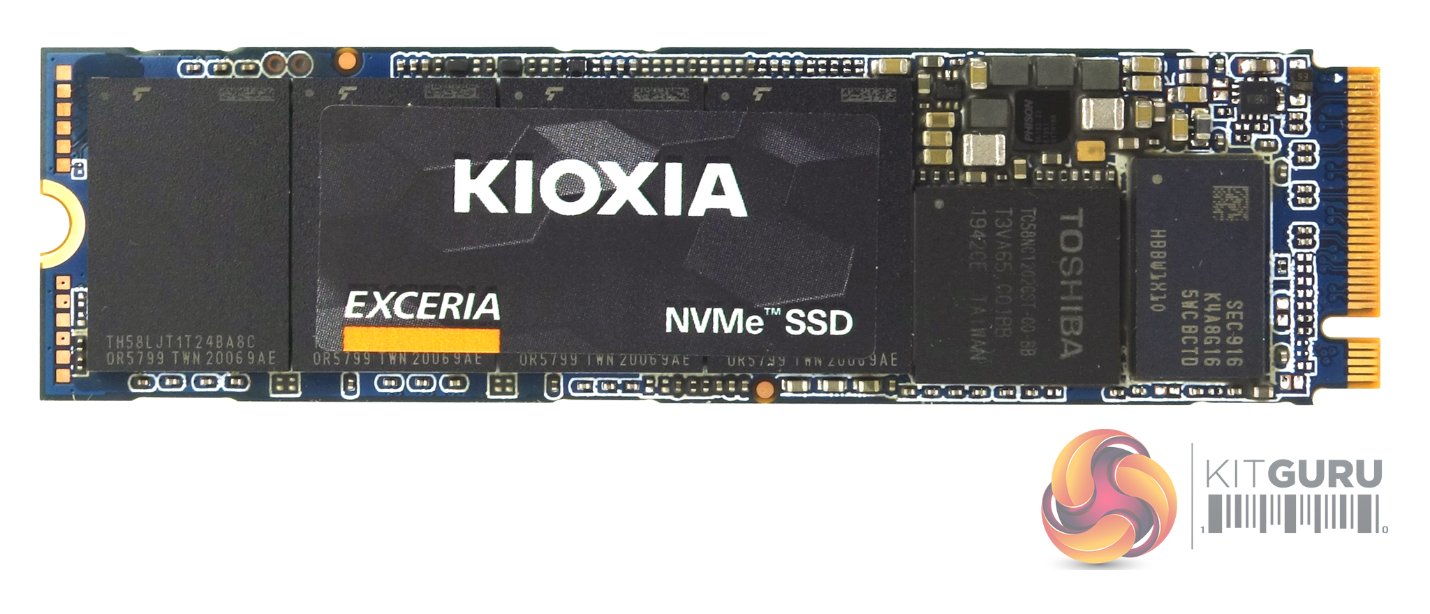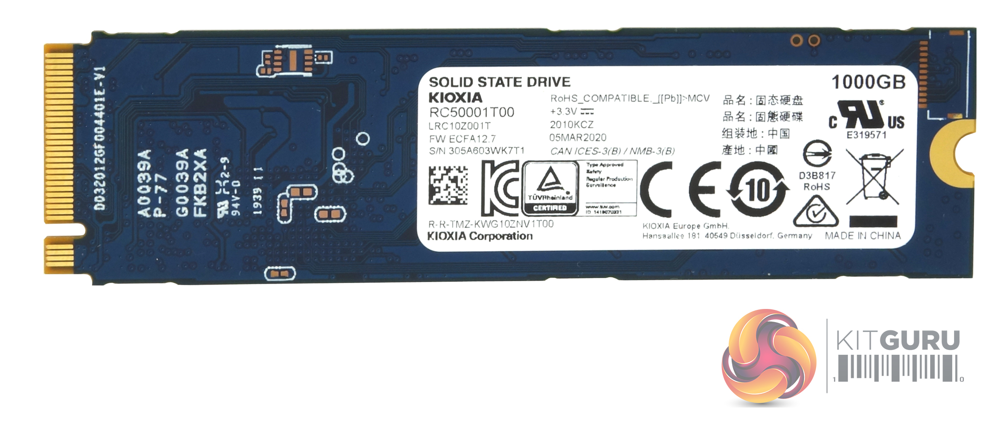 The Exceria NVMe 1TB drive is built on a single-sided M.2 2280 format. There are four packages of Kioxia BiCS4 96-layer 3D TLC NAND, then comes the 4-channel controller (coded TC58NC1202GST) and finally a 512MB DDR4-2400MHz cache IC.