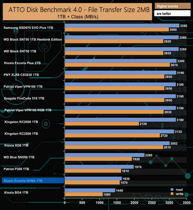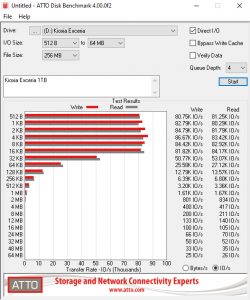 Kioxia rate the Sequential read/write performance of the drive as up to 1,700MB/s and 1,600MB/s respectively. We could confirm both figures under testing with reads of 1,630MB/s and writes of 1,570MB/s using the ATTO benchmark.
