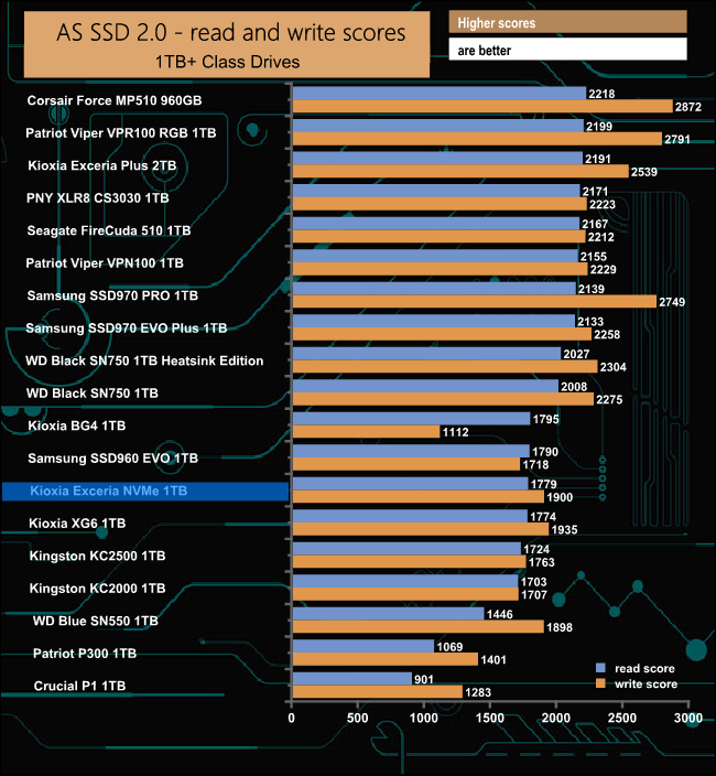 In the more stringent AS-SSD test, the Exceria NVMe performs pretty well with decent read and write scores.
