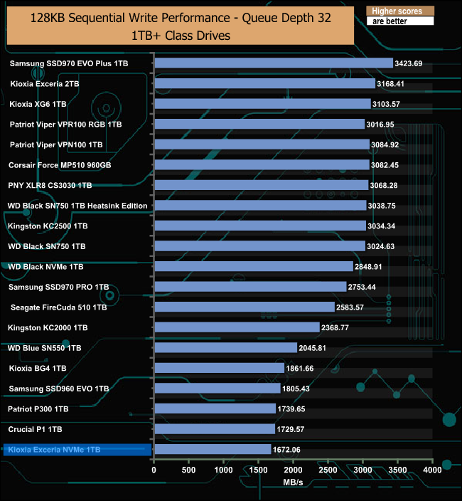 The Sequential read performance of the Exceria NVMe holds up quite well at QD's 1 and 2 but falls away as the queue depth deepens.