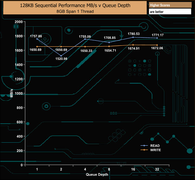 Using our own Sequential tests we could confirm the official read figure of 1,700MB/s, the drive producing a score of 1,780.53MB/s (QD16). Tested writes were 1,674.91MB/s (QD16) slightly better than the official 1,600MB/s.