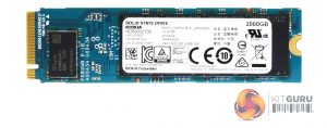 The Exceria Plus 2TB drive is built on a dual-sided M.2 2280 format. On one side of the PCB sits the 8-channel Toshiba branded controller (coded TC58NC1201GST-00-BB), four 256GB packages of BiCS4, 96-Layer 3D TLC NAND and a cache IC (SK hynix H5AN8G6NCJ, DDR4-2666). The other side of the PCB is home to another cache chip and four more 256GB NAND packages.
