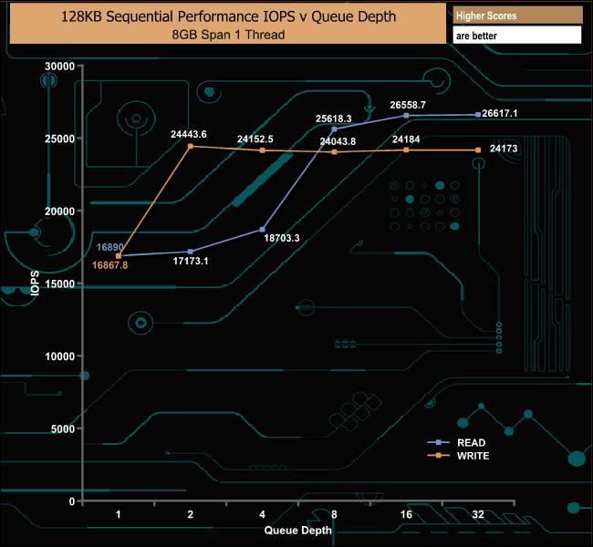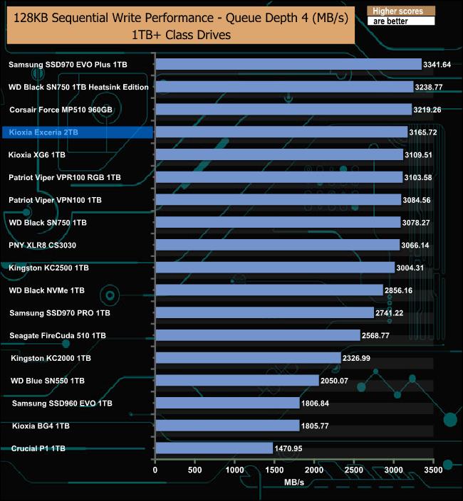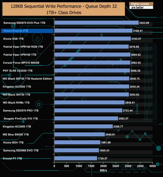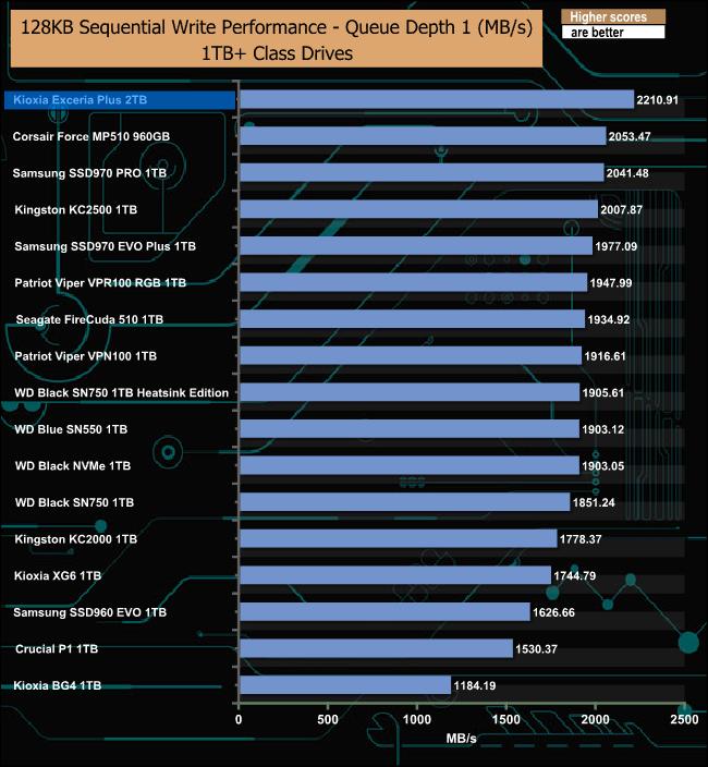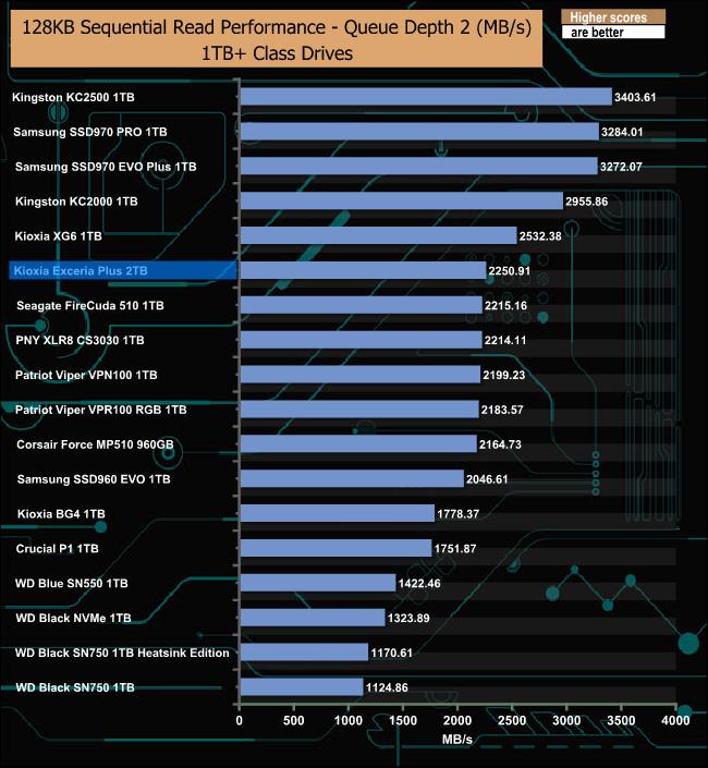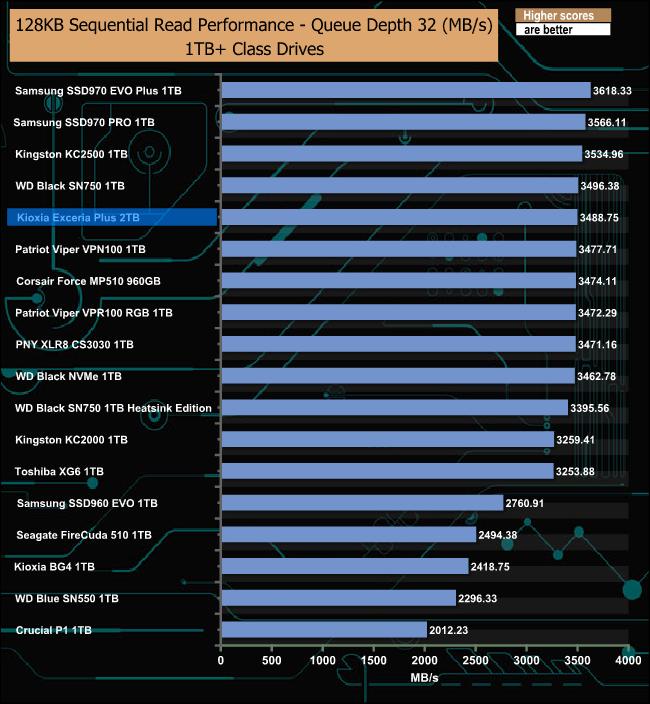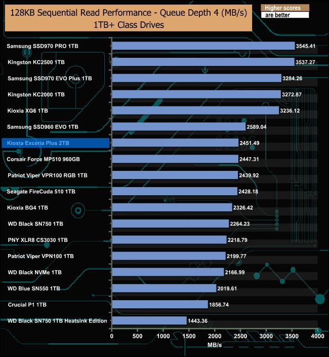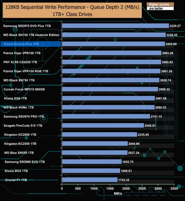 At a queue depth of 1, the Kioxia Exceria Plus is the fastest PCIe Gen 3 drive we have seen to date. As the queue depth deepens the drive does begin to fall back amongst its competitors but does recover to sit in second place in our results chart at a QD of 32.