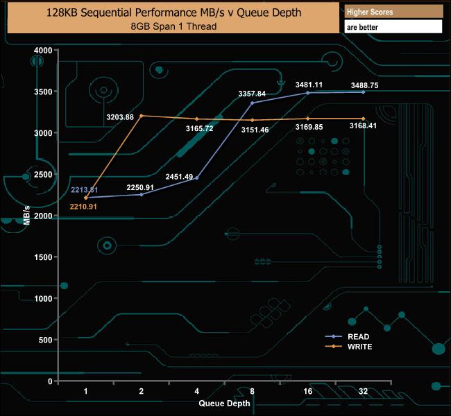 With our own Sequential tests, we could confirm the official maximum read/write figures of 3,400MB/s and 3,200MB/s respectively with a read result of 3,488MB/s (QD32) and writes coming in at 3,203MB/s (QD2).