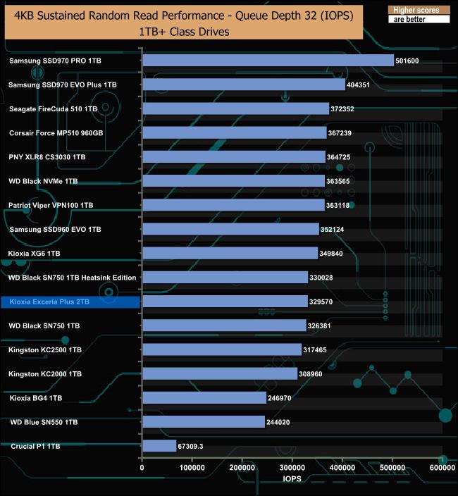 The official 4K random read figure for the drive is up to 680,000 IOPS, this figure is from the drive being tested at a QD of 32 using 8 threads. With our 4-threaded tests, we couldn't get close to this figure, the best we saw was 329,570 IOPS at a QD of 32. We did a quick test using 8 threads at a QD of 32 and the best we got from the review drive was 517,506 IOPS, still a fair way off the official maximum figure.