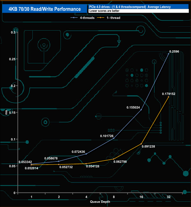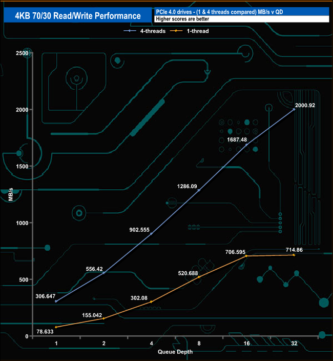 We used CrystalDiskMark 8’s custom settings to test the 4K 70/30 mixed read/write performance of the drive through a range of queue depths using a single thread and four threads.