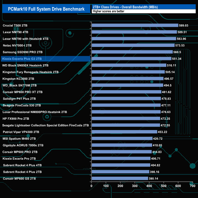 The Kioxia Exceria Plus G3 produces an overall bandwidth figure for the benchmark of 551.34MB/s which is good enough to put the drive into the top 10 in our results chart.