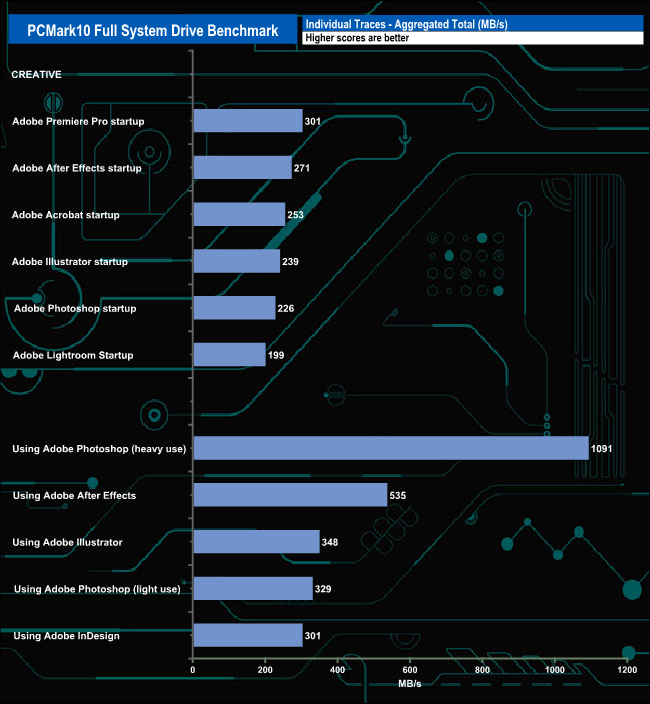 The PCMark 10 Full System Drive Benchmark uses a wide-ranging set of real-world traces from popular applications and common tasks to fully test the performance of the fastest modern drives. The benchmark is designed to measure performance of fast system drives using the SATA bus at the low end and devices connected via PCI Express at the high end.
