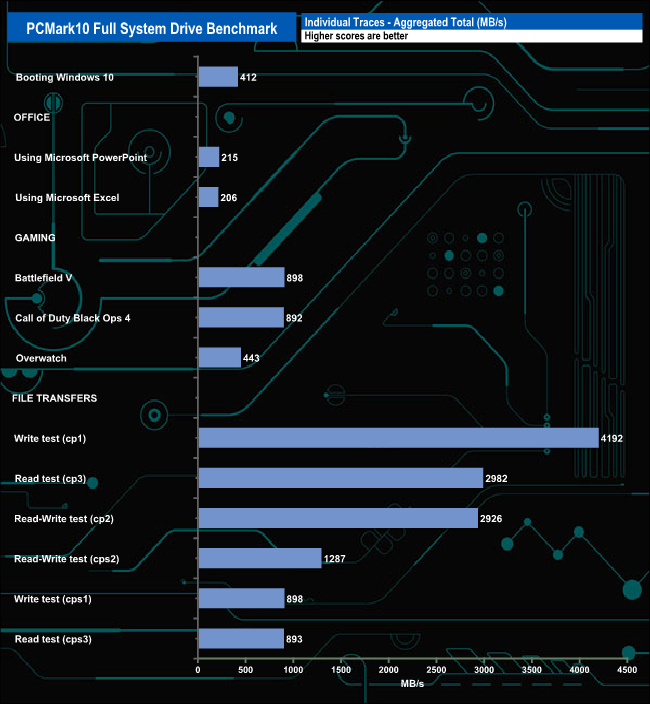 The drive averaged 744MB/s for the three gaming test traces, the fastest being Battlefield V at 898MB/s just ahead of Call Of Duty Black Ops 4 at 892MB/s and finally Overwatch at 443MB/s. When it came to the file transfers, the fastest was the cp1 write test at 4,192MB/s. Overall the drive averaged 2,196MB/s for the six file transfer tests.