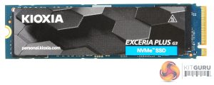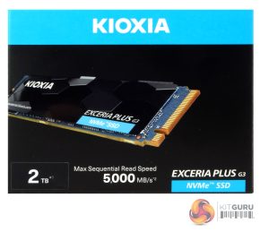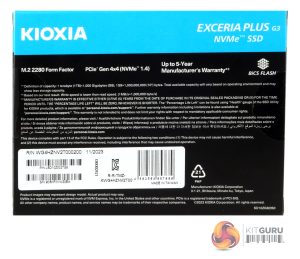 Kioxia's Exceria Plus G3 comes in a compact box with an image of the drive on the front, along with a sticker displaying the capacity of the drive and the drive's Sequential read speed (up to 5,000MB/s). The rear of the box has a description of the drive’s form factor, a small logo representing it uses BiCS Flash, PCIe Gen 4 x4 interface and has a 5-year warranty.