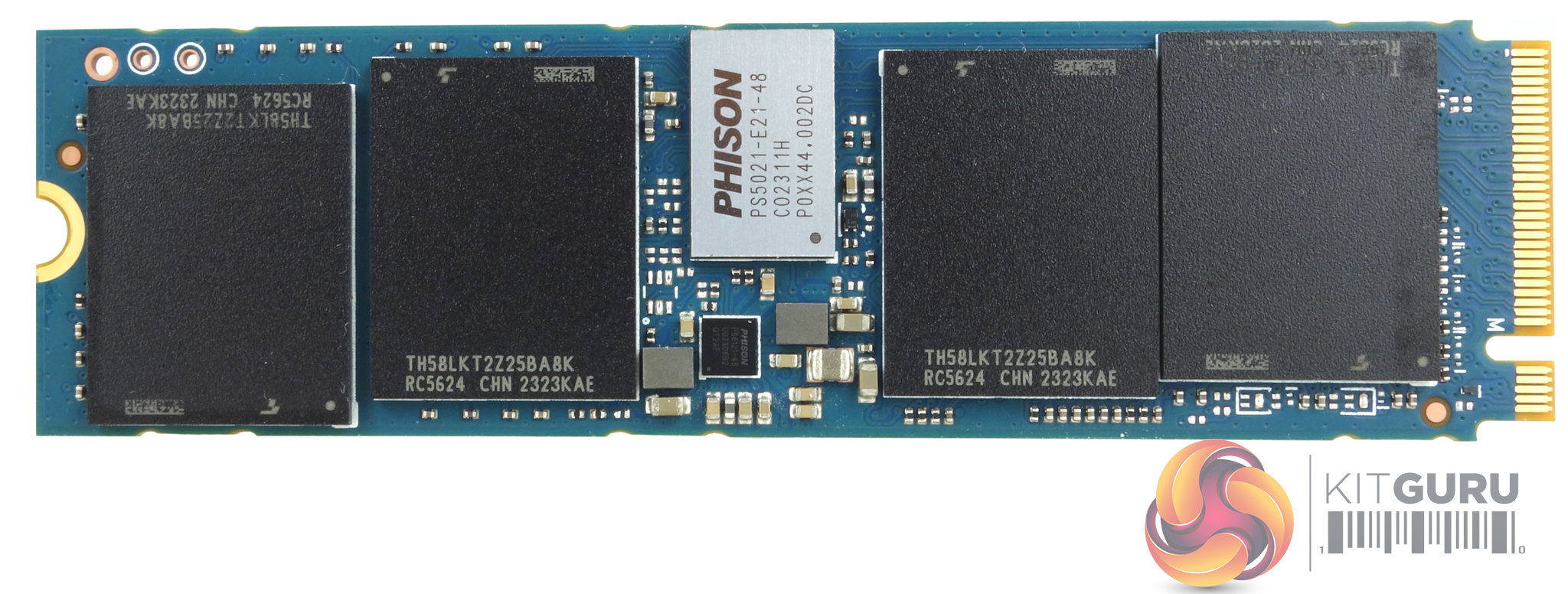 With the drive being built on a single-sided format, all the components are to be found on one side of the PCB. Alongside the Phison PS5021-E21 controller are four packages of BiCS TLC NAND (coded TH58LKT2Z25BA8K). Phison's PS5021-E21T is a 4-channel controller built on a 12nm process using single-CPU architecture (built-in ARM Cortex-R5). Designed for DRAM-less operation, it supports both TLC and QLC NAND with a transfer rate of up to 1600MT/s and has a capacity limit of 4TB. Data reliability is provided by Phison's 4th generation LDPC ECC along with End-To-End Data Path Protection and Smart ECC 2.0. It also supports AES 256-bit Encryption.