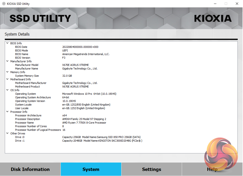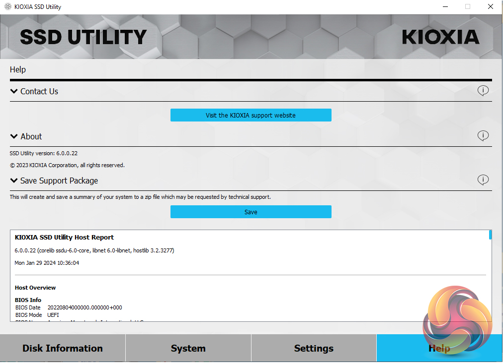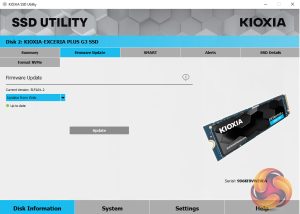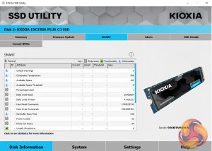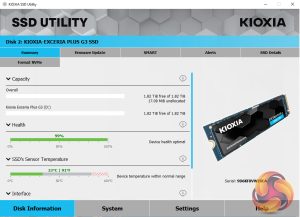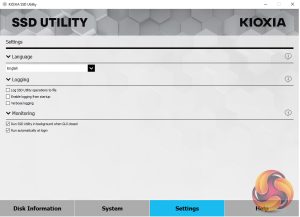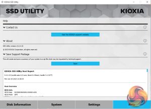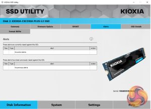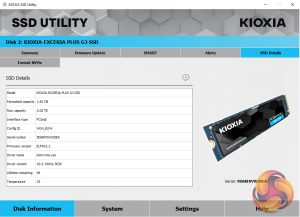 Kioxia's SSD Utility drive management software has had a bit of a refresh with a better-looking interface. There are four main sections; Disk Information, System, Settings and Help. All the key tools are to be found on the Disk Information page under separate tabs. These allow you to check drive capacity usage, health and temperature, SMART information, drive alerts and perform operations such as firmware updates and secure erase.