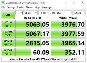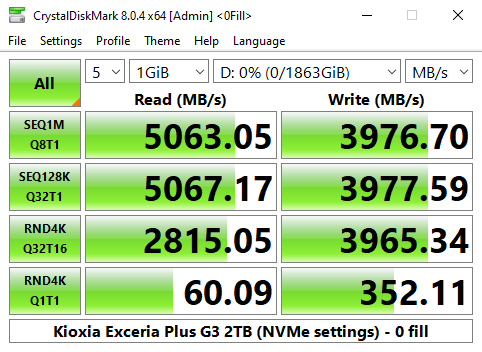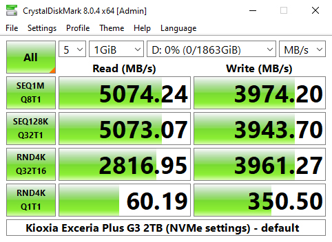 As with the default test, we could confirm the official Sequential read and write performance figures with test results of 5,036MB/s and 3,974MB/s for reads and writes respectively.