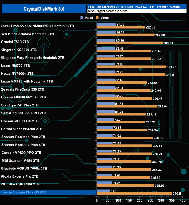 Using the default CrystalBenchMark 8 4K QD1 T-1 benchmark the read result of 60.19MB/s sees the Exceria Plus G3 sitting in last place on our results chart. However, its write score of 350.50MB/s is the fastest we've seen to date for a 2TB class Gen 4 drive in this particular test.