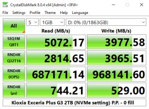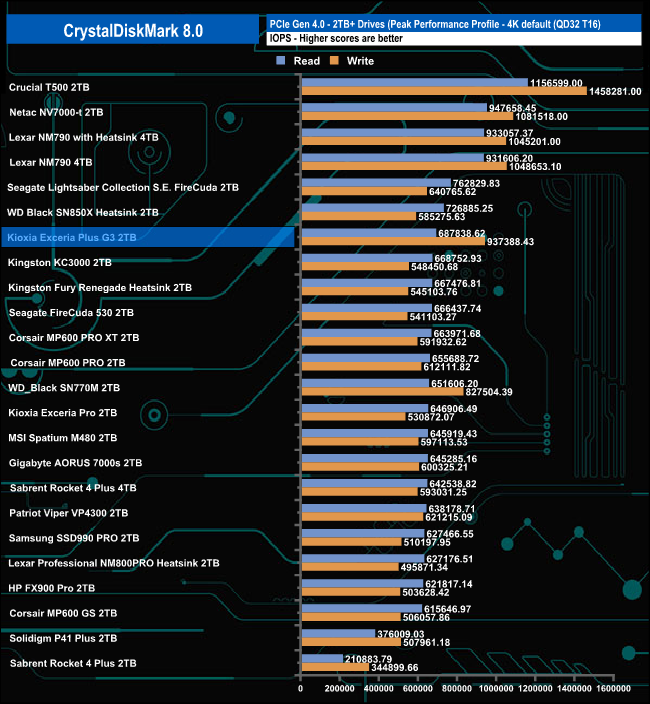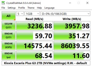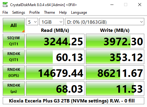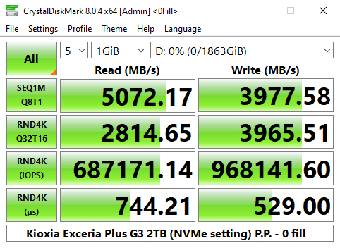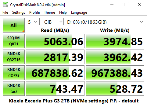 Kioxia quotes 4K random performance figures for the 2TB version of the Exceria Plus G3 of up to 680,000 IOPS for reads and up to 950,000 IOPs for writes. When tested with the Peak Performance profile test in CrystalDiskMark 8 we could confirm those figures and even better them a little. The best read score we saw was 687,838 IOPS while the best write result was 967,388 IOPS using the default test.