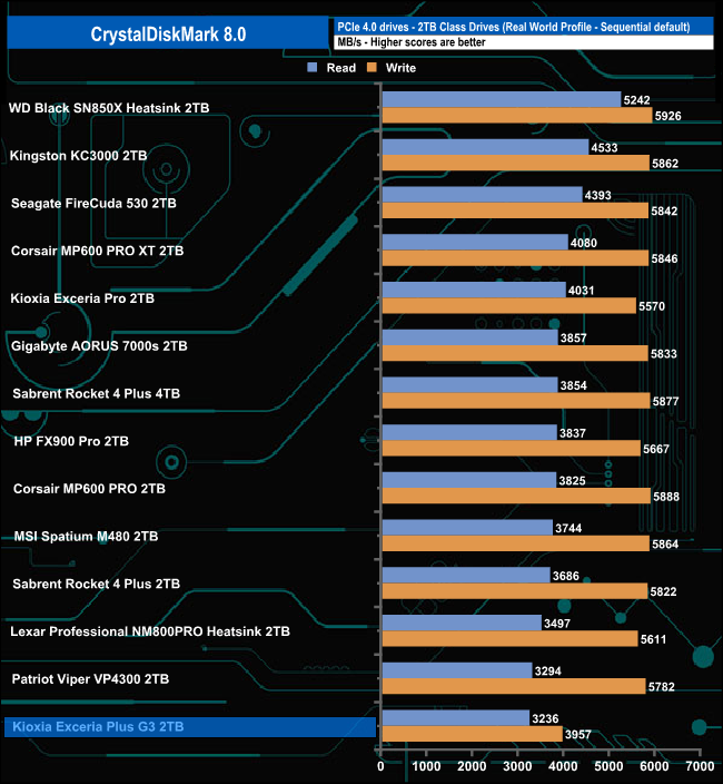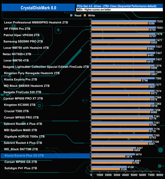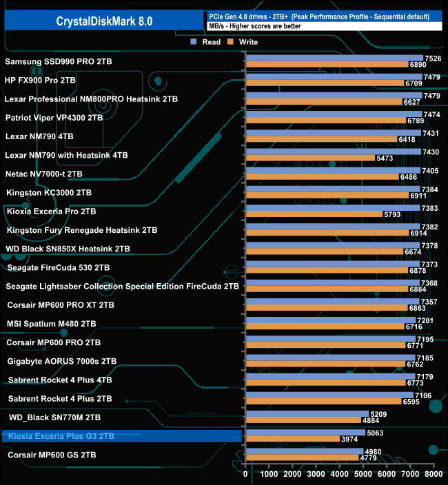 The Exceria Plus G3's Sequential read test result of 5,074MB/s puts the drive in the bottom section of our results chart.