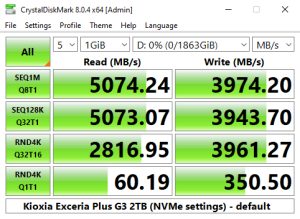 Looking at the default benchmark result screens we could confirm both the official Sequential maximums of up to 5,000MB/s and 3,900MB/s for reads and writes respectively with a read test result of 5,074.24MB/s with writes at 3,974.20MB/s.