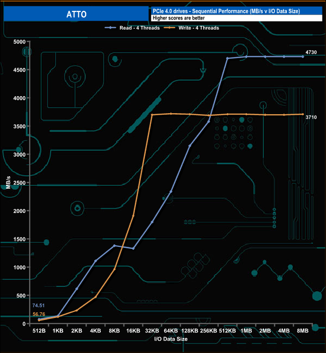 With the ATTO benchmark results the drive fell just short of the official 5,00MB/s and 3,900MB/s for reads and writes respectively, with reads at 4,738MB/s and writes at 3,710MB/s.