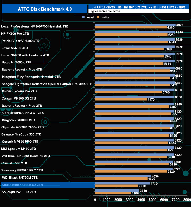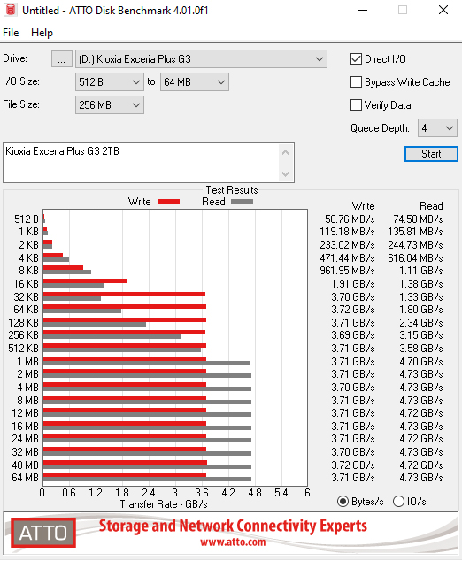 During the ATTO test run, the read performance peaked at the 2MB mark at 4,730MB/s and it kept at that mark more or less for the rest of the test run. When it comes to write performance, the drive starts to plateau to some extent from the 64KB mark.