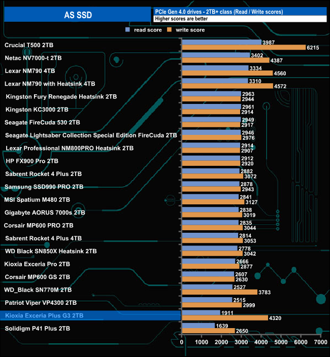 The Exceria Plus G3's read score of 1911 sees it sitting in the penultimate place in our results chart. However, its write score of 4320 is very impressive, it's the fourth fastest we've seen for this class of drive to date.