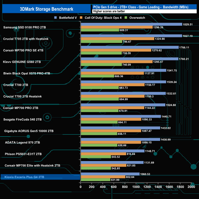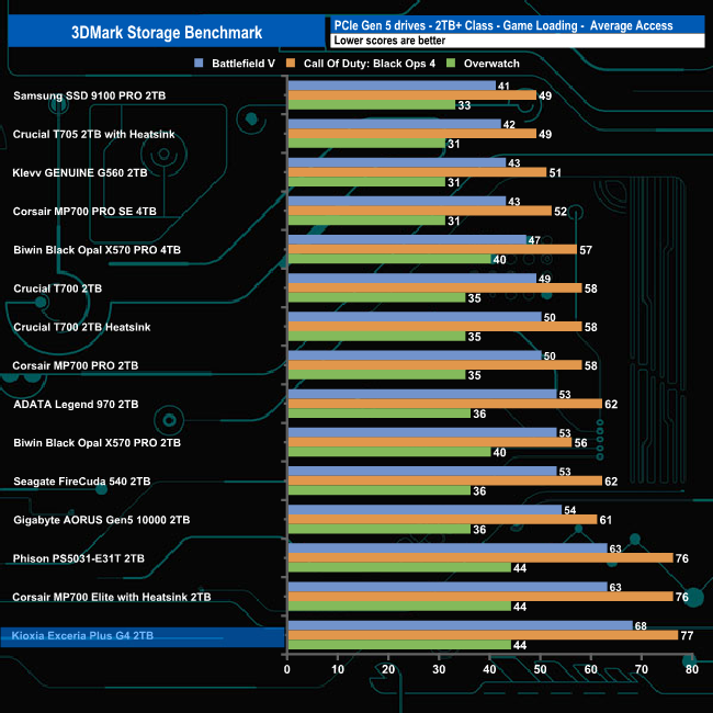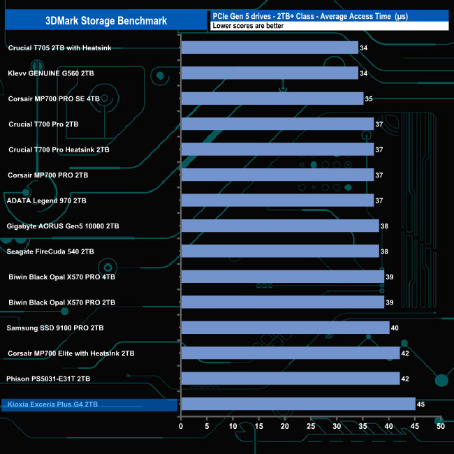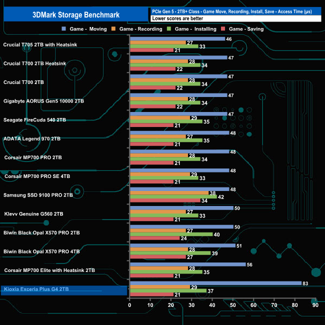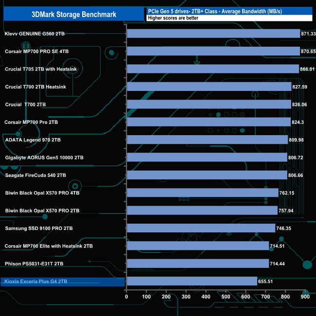 In 3DMark’s Storage Test, the Exceria Plus G4 produced an average game loading bandwidth figure for the three games of 798.38MB/s with an average access time of 63µs, which is more or less the same performance as the Phison E31T reference design and Corsair's MP700 Elite, which also uses the E31T.
