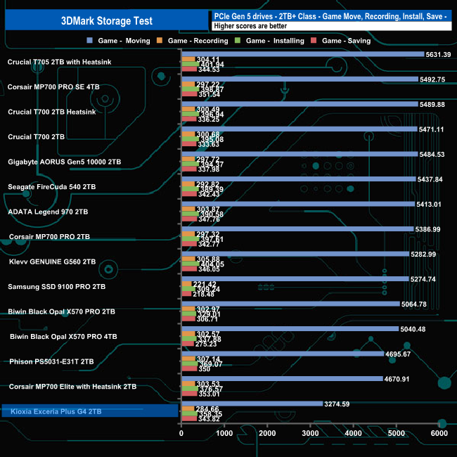 In the Game Move, Recording, Installing and Saving traces part of the benchmark, the drive averaged 1,065.32MB/s with an average access time for the four tests of 42.5µs, which sees the drive in last place on the table, quite some way back from the other E31T equipped drives.