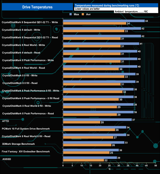 Under benchmarking, the hottest the drive got was 44°C when the drive was running the CrystalDiskMark 8 Sequential QD1-32 T1 Write test. For the majority of the testing, the drive averaged 38°C, which for a Gen5 drive is very impressive, while the 4 K-based tests averaged out at 33°C, another impressive figure.