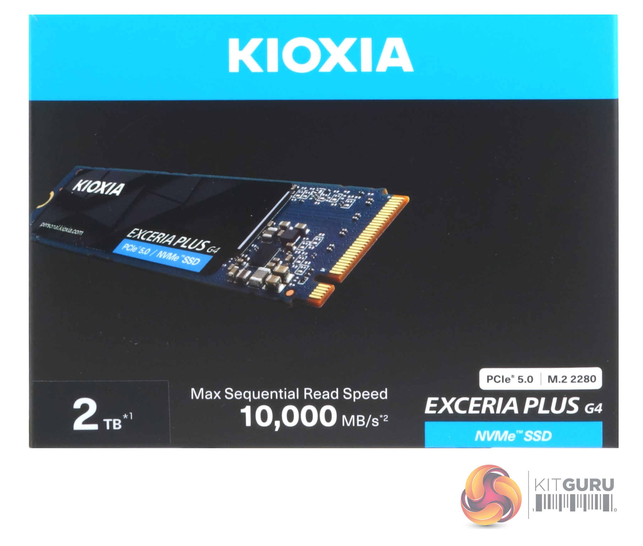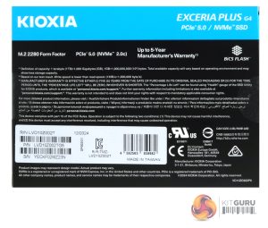 Kioxia's Exceria Plus G4 comes in a compact box with an image of the drive on the front, along with a sticker displaying the capacity of the drive and the drive's Sequential read speed (up to 10,000MB/s). The rear of the box has a description of the drive’s form factor, a small logo representing it uses BiCS Flash, PCIe 5.0 (NVMe 2.0c) interface and has a 5-year warranty.
