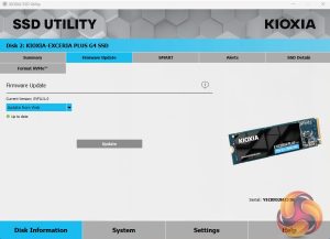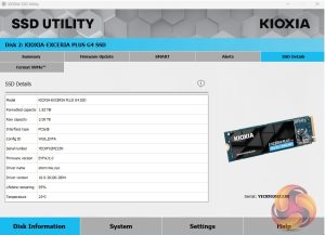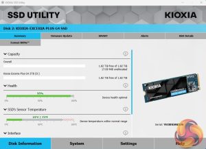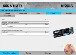 Kioxia's SSD Utility drive management software has four main sections: Disk Information, System, Settings and Help. All the key tools are to be found on the Disk Information page under separate tabs. These allow you to check drive capacity usage, health and temperature, SMART information, drive alerts and perform operations such as firmware updates and secure erase.