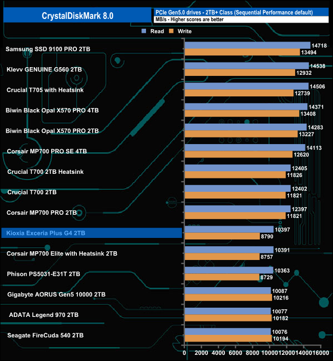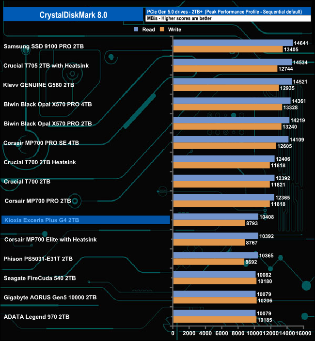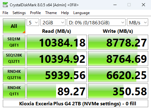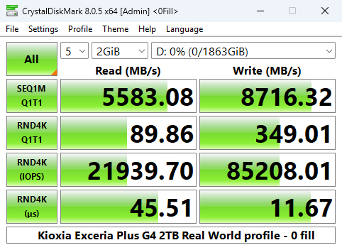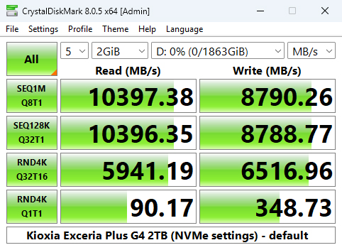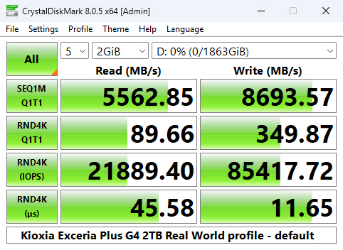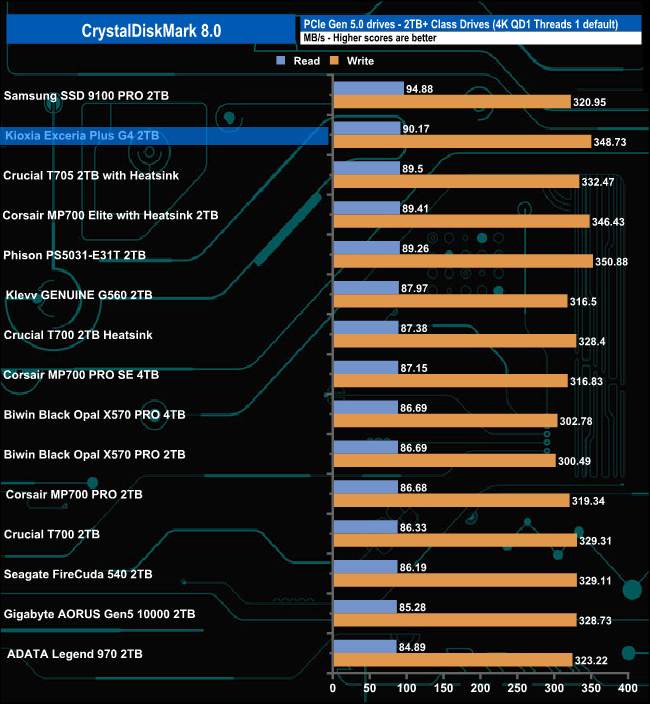 Kioxia's Exceria Plus G4 does very well in the CrystalDiskMark 8 4K QD1 T1 test, with a read score of 90.17MB/s, the second fastest behind Samsung's SSD 9100 PRO. Its write result of 348.73MB/s is also the second fastest we've seen to date.