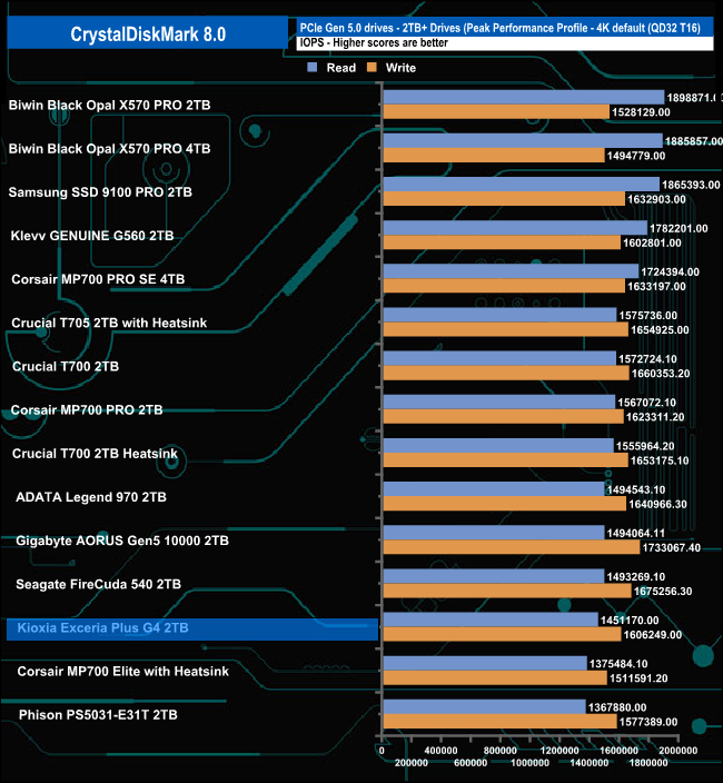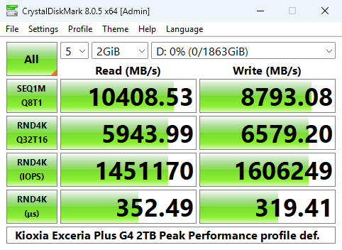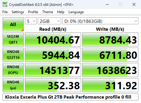We can confirm the official random 4K figures for the drive of up to 1,300,000 IOPS for reads and up to 1,500,000 IOPS for writes and, indeed, better them a little using the Peak Performance profile of CrystalDiskMark 8 with default test results of 1,451,170 IOPS for reads and 1,606,249 IOPS for writes.