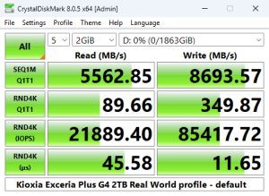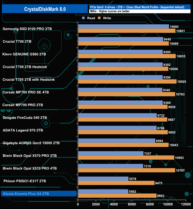 Using the Real World profile tests in CrystalDiskMark 8, the drive produced Sequential read / write results of 5,562MB/s and 8.693MB/s, respectively, putting it at the foot of the results chart.