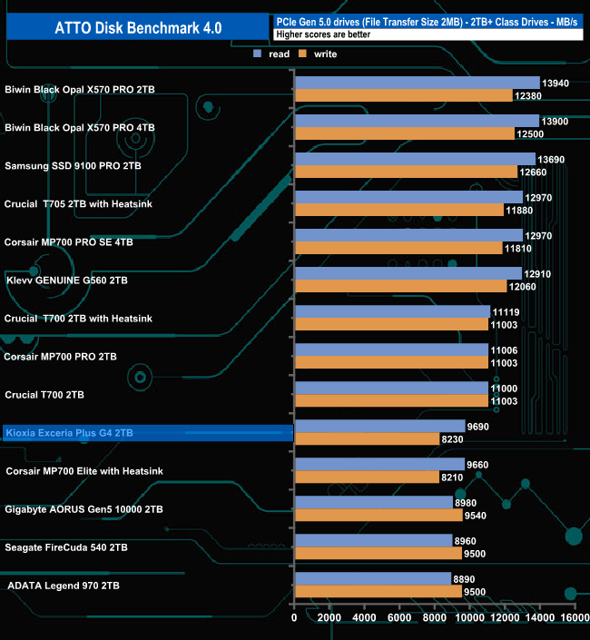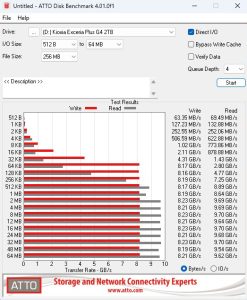 Using the ATTO benchmark, we couldn't hit the official sequential read figure of 10,000MB/s, but we got pretty close with a result of 9,690MB/s. However, we could confirm the official write rating with a test result of 8,230MB/s.