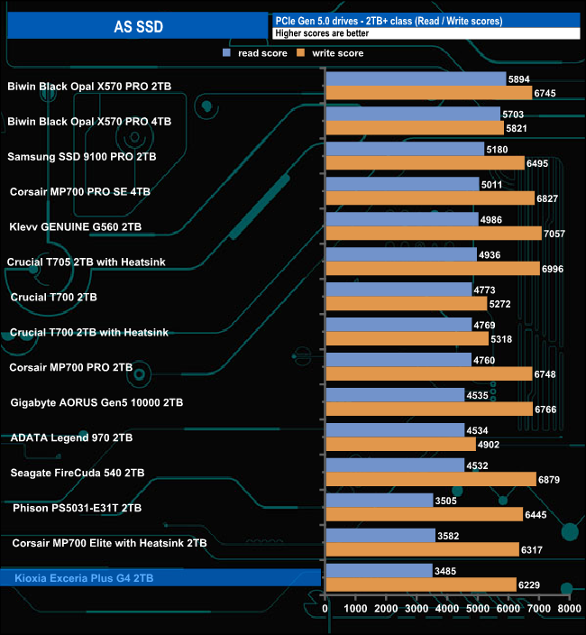 The Kioxia Exceria Plus G4 sits below the other two drives using the Phison PS5031-E31T, the reference Phison E31T design and Corsair's Corsair MP700 Elite with Heatsink.