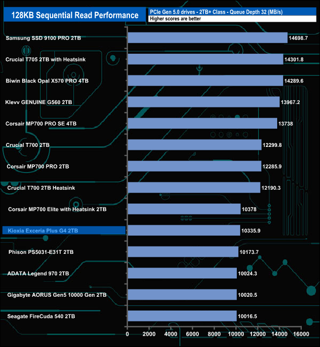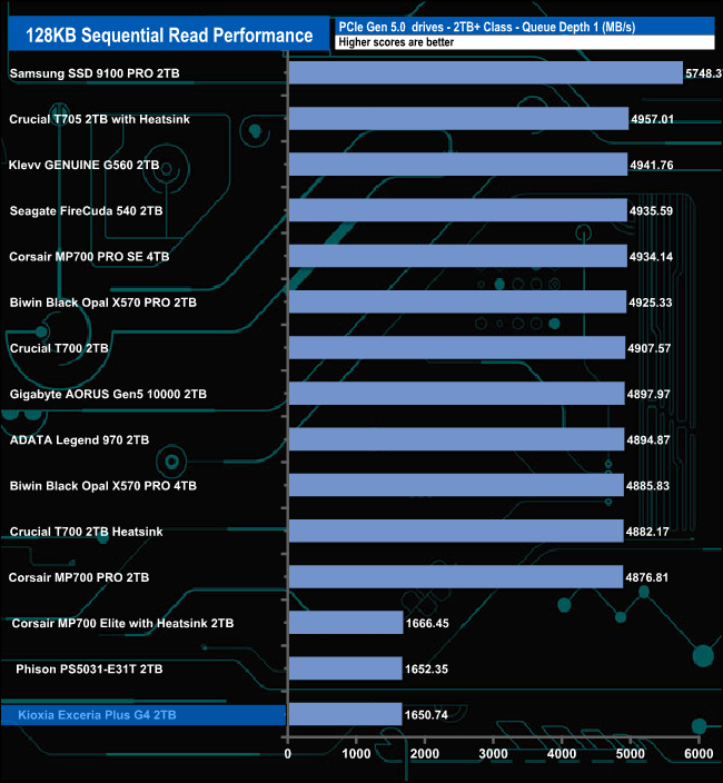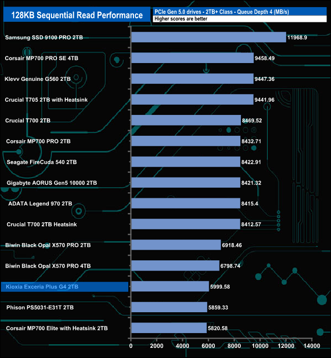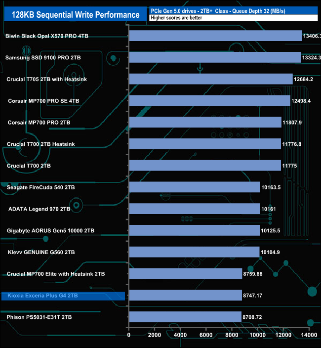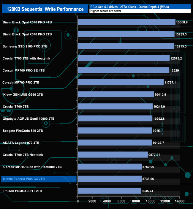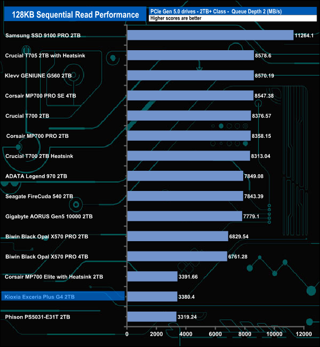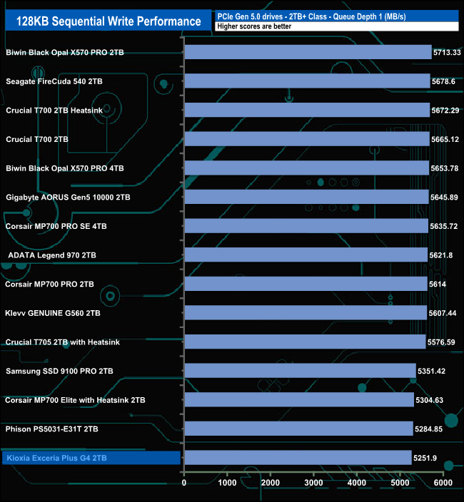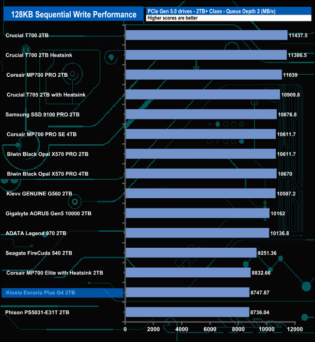 When it comes to the sequential write test results the Kioxia Exceria G4 sits in last place at QD1. However at QDs 2, 4 and 32, the drive seperates the two other drives using the Phison E31T controller, the Phison reference design and the Corsair MP700 Elite.