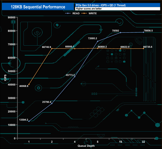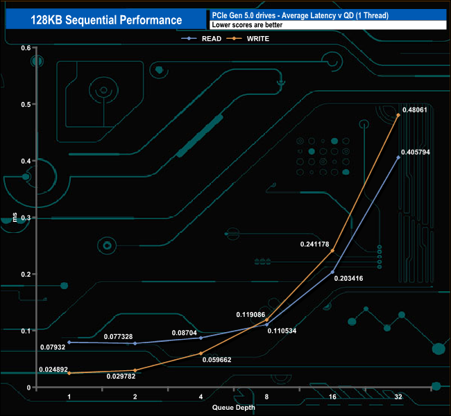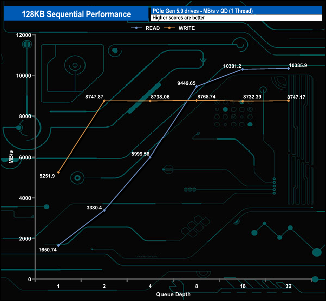 We used CrystalDiskMark 8‘s custom settings to test the Sequential read and write performance of the drive through a range of queue depths. The setup for the tests is listed below.