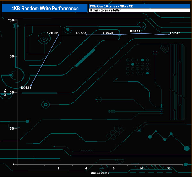 We used CrystalDiskMark 8‘s custom settings to test the 4K random write performance of the drive through a range of queue depths. The setup for the tests is listed below.